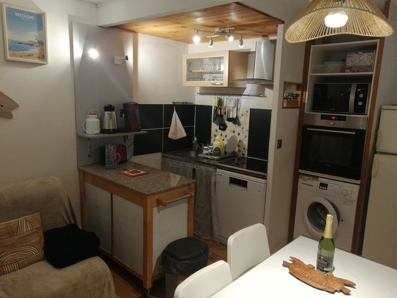 Un coin cuisine (grand four électrique, plaque de cuisson à induction, four micro-onde grill,frigo-congélateur,grille-pain,cafetière, bouilloire, cocotte-minute,vaisselle, divers plats, aspirateur..(une liste complète peut vous être fournie)
