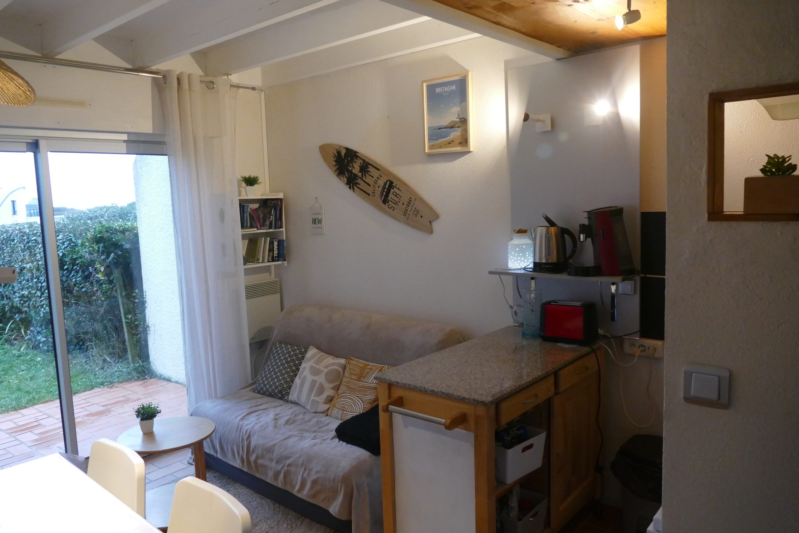 A L’ EXTERIEUR: une terrasse privative (salon de jardin,parasol,chaises longues ..), une pelouse de 20m2 clos par une haie et une barrière.