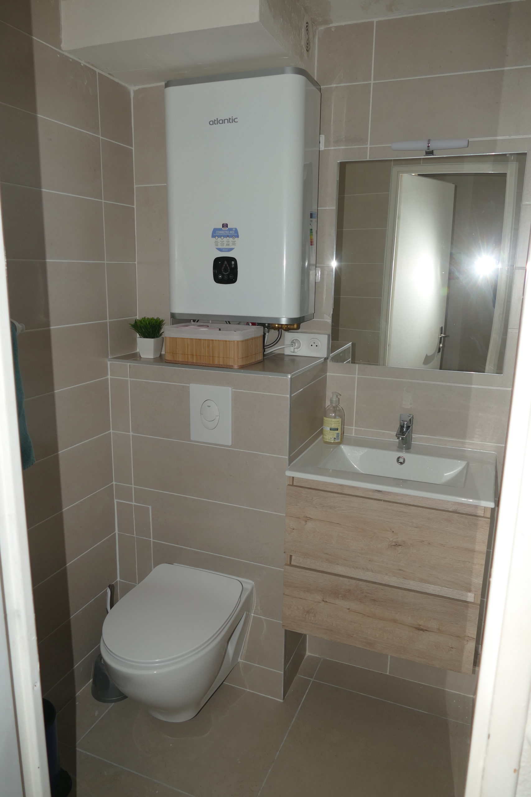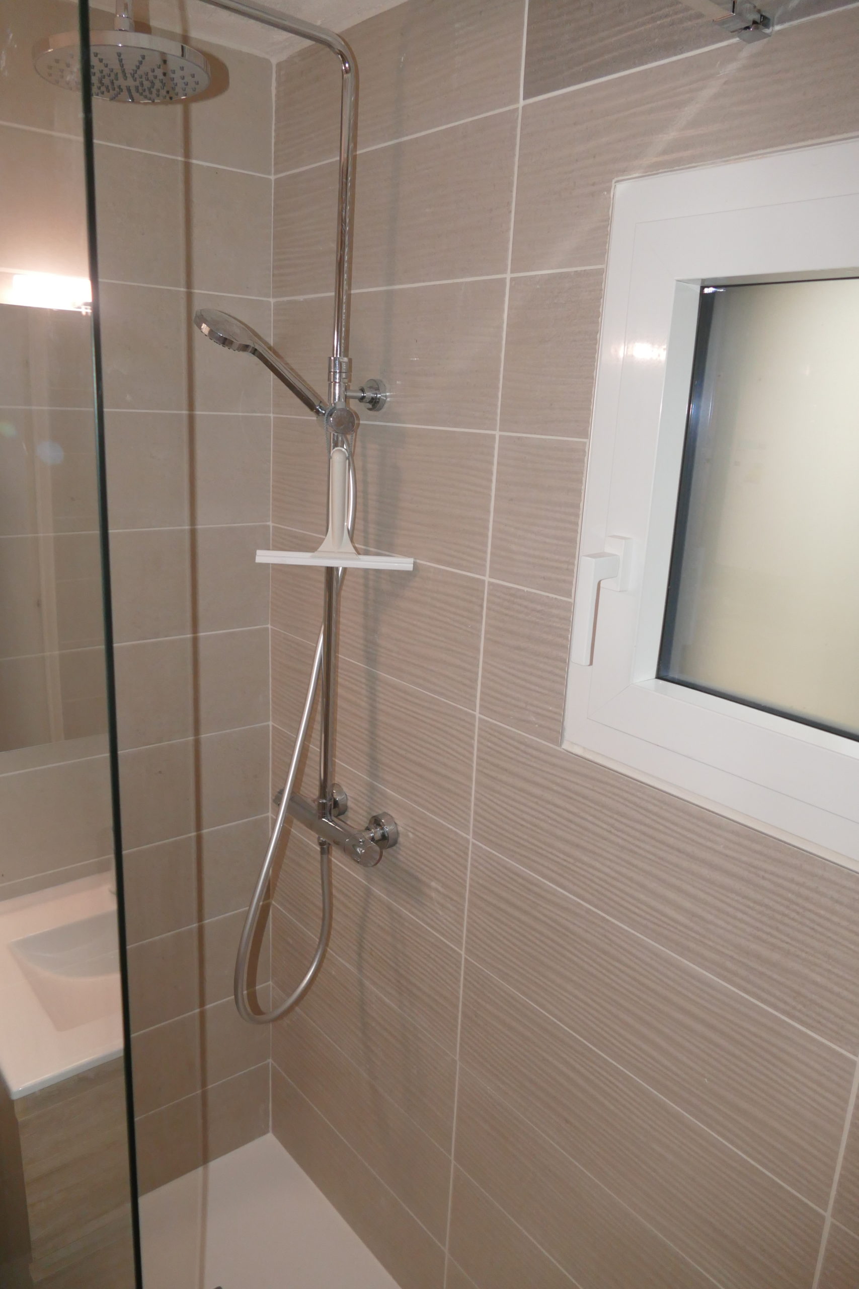 Une salle de bain avec douche, lavabo, wc.